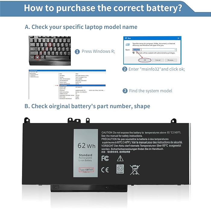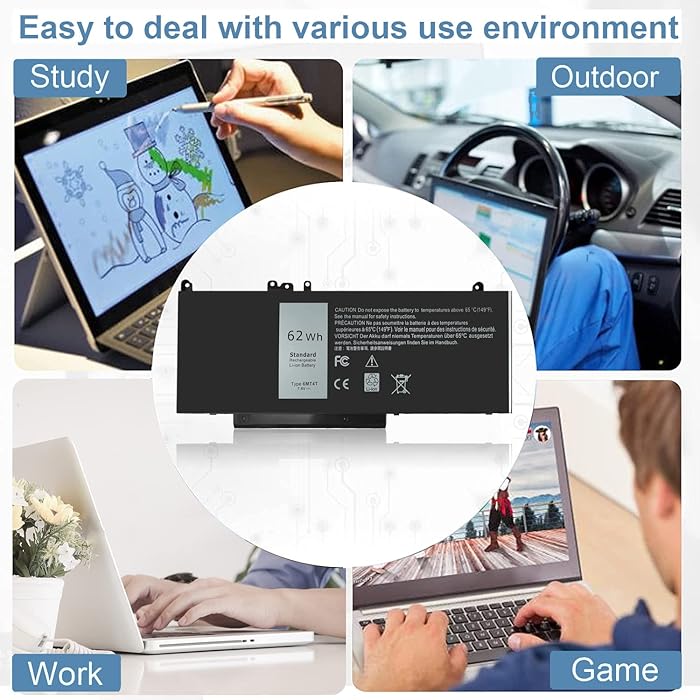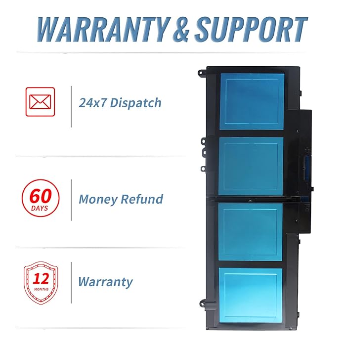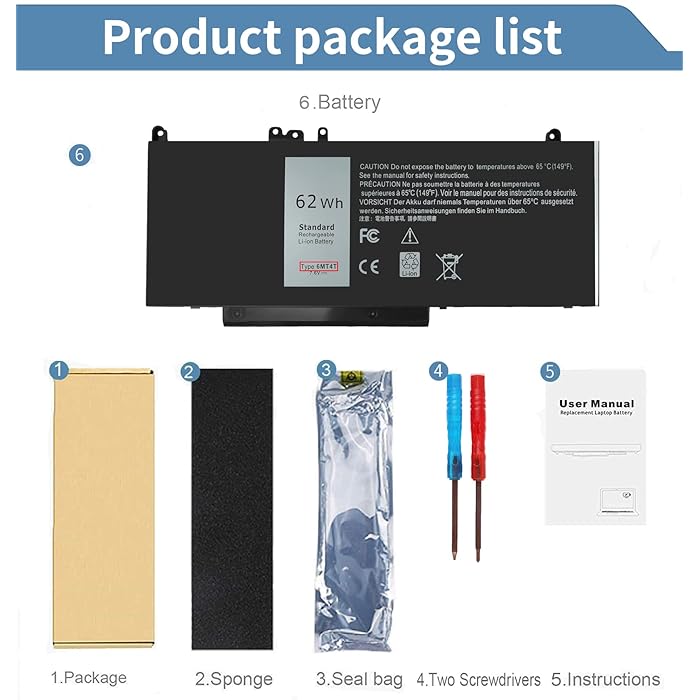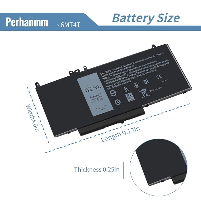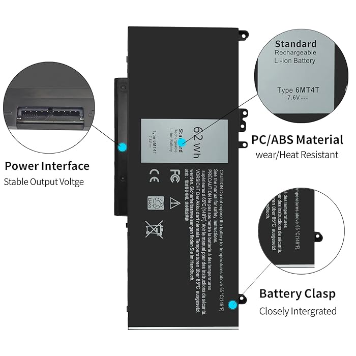SPECIFICATION : Model: Type 6MT4T; Battery Type: Lithium polymer ; Voltage: 7.6V; Capacity: 62Wh; Cells: 4-cell; Condition: New; Packages includes: 1PC 6MT4T laptop battery(with two free screwdrivers for easy installation)