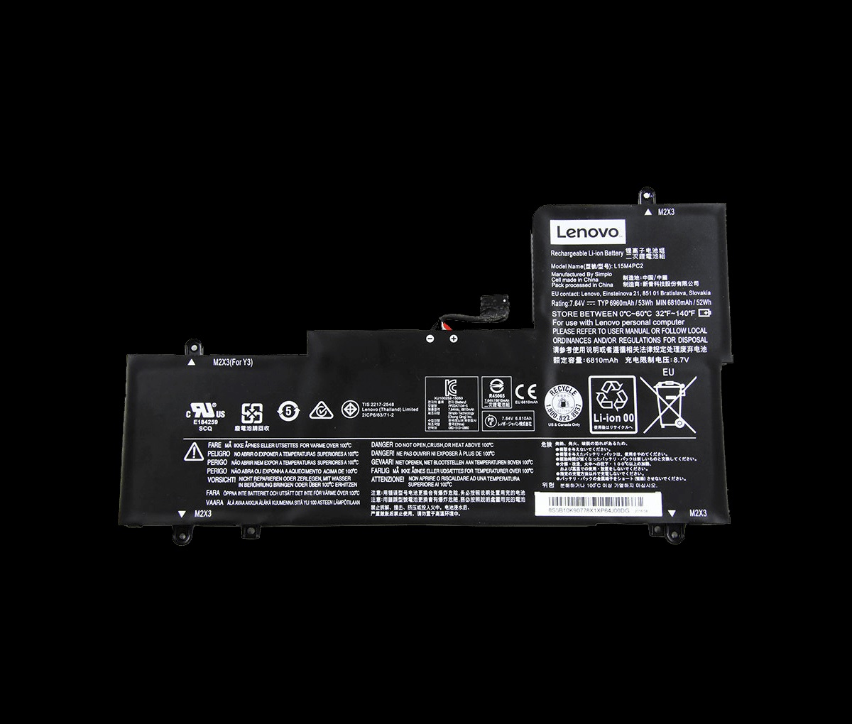 Model: L15M4PC2 / Voltage: 7.64V / Capacity: 53Wh 6960mAh / Color: Black / Type: Plug & Play Li-ion Battery.